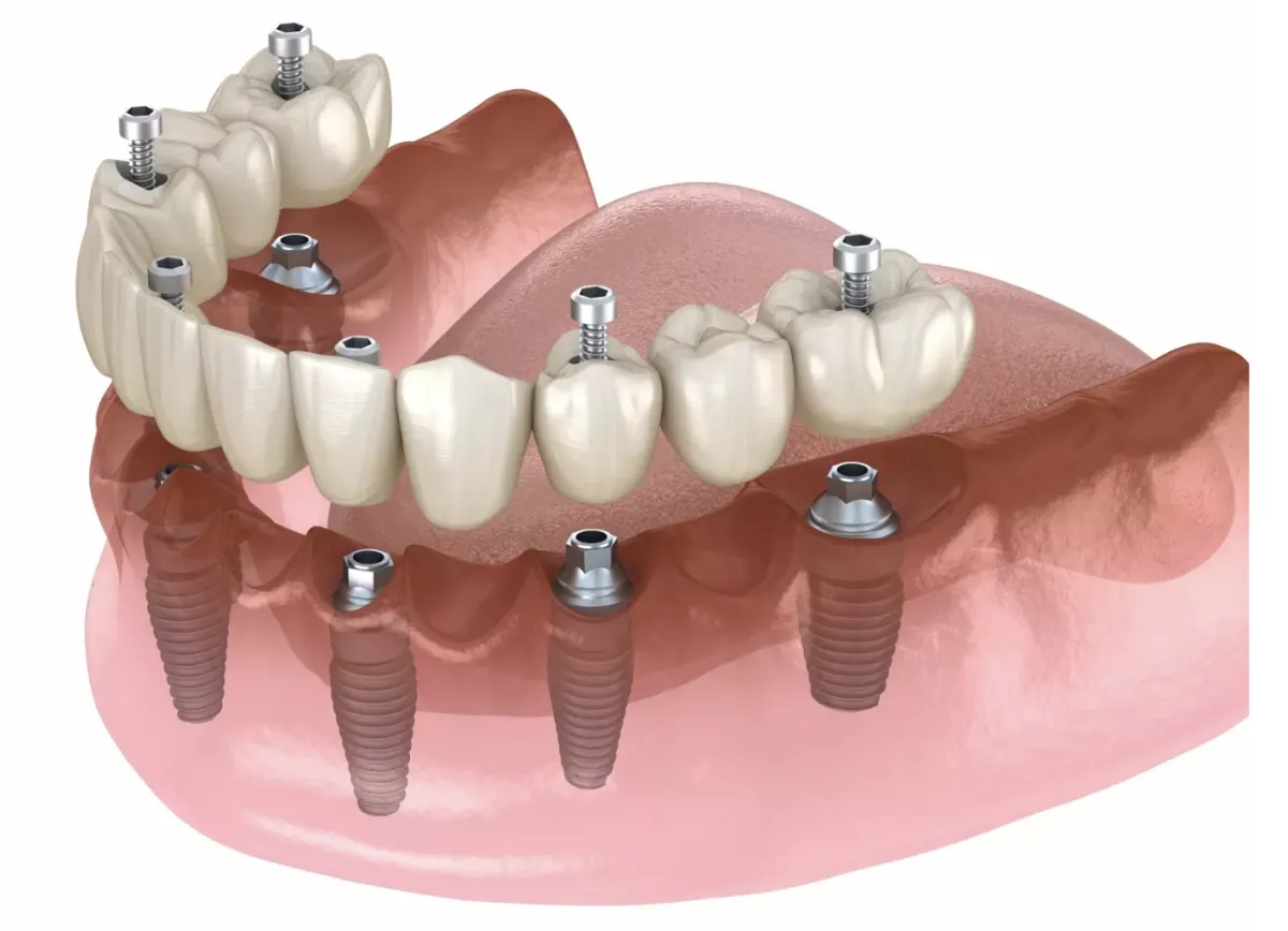 A full arch implant bridge is done by placing at least 4 implants in the jaw. A restorative dentist then secures a full set teeth onto the implants that are either removable or fixed to the implants.