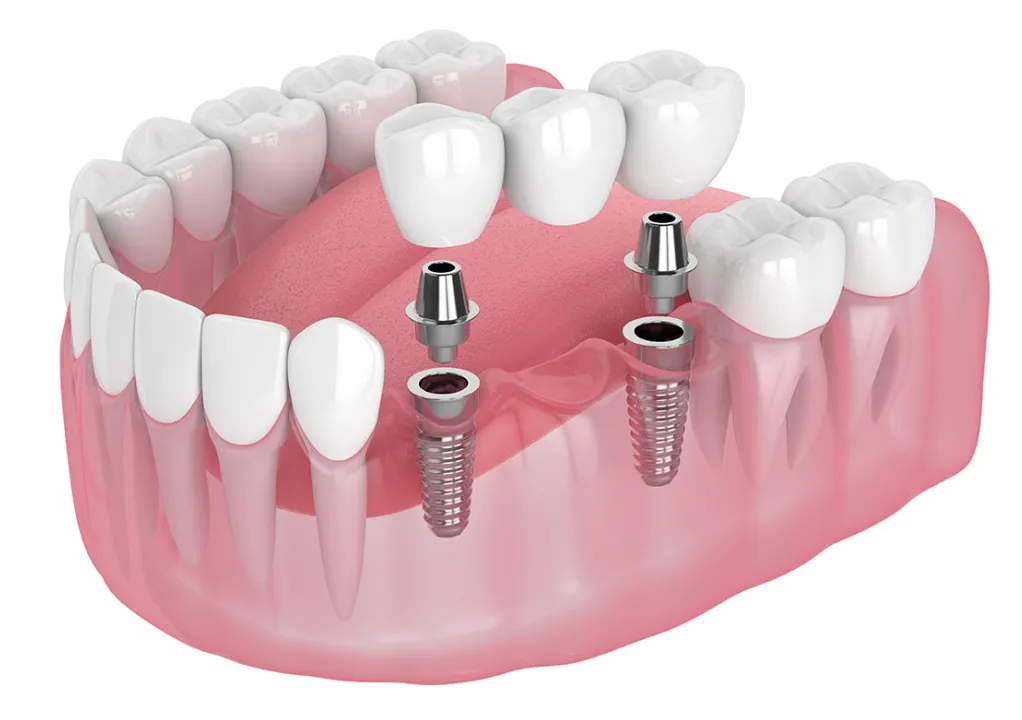 A dental implant bridge is an economical and effective way of replacing multiple teeth on less implants (as seen in photo). For example, you can place 2 implants to restore 3 missing teeth.